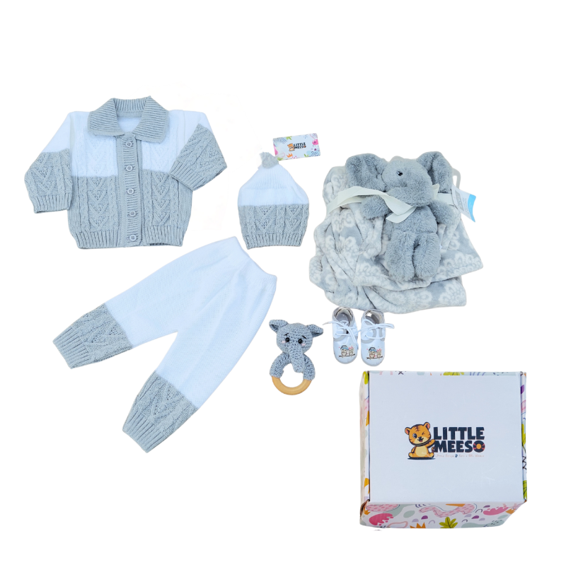 Wrap your little one in warmth and style with our beautifully knitted woolen set. It features a cozy long-sleeved top with matching pajama pants and a cute cap for a snug, classic look. The set comes with a soft matching blanket, a cuddly elephant plush toy, and a hand-knitted elephant rattle — making it the perfect blend of comfort, charm, and timeless elegance.