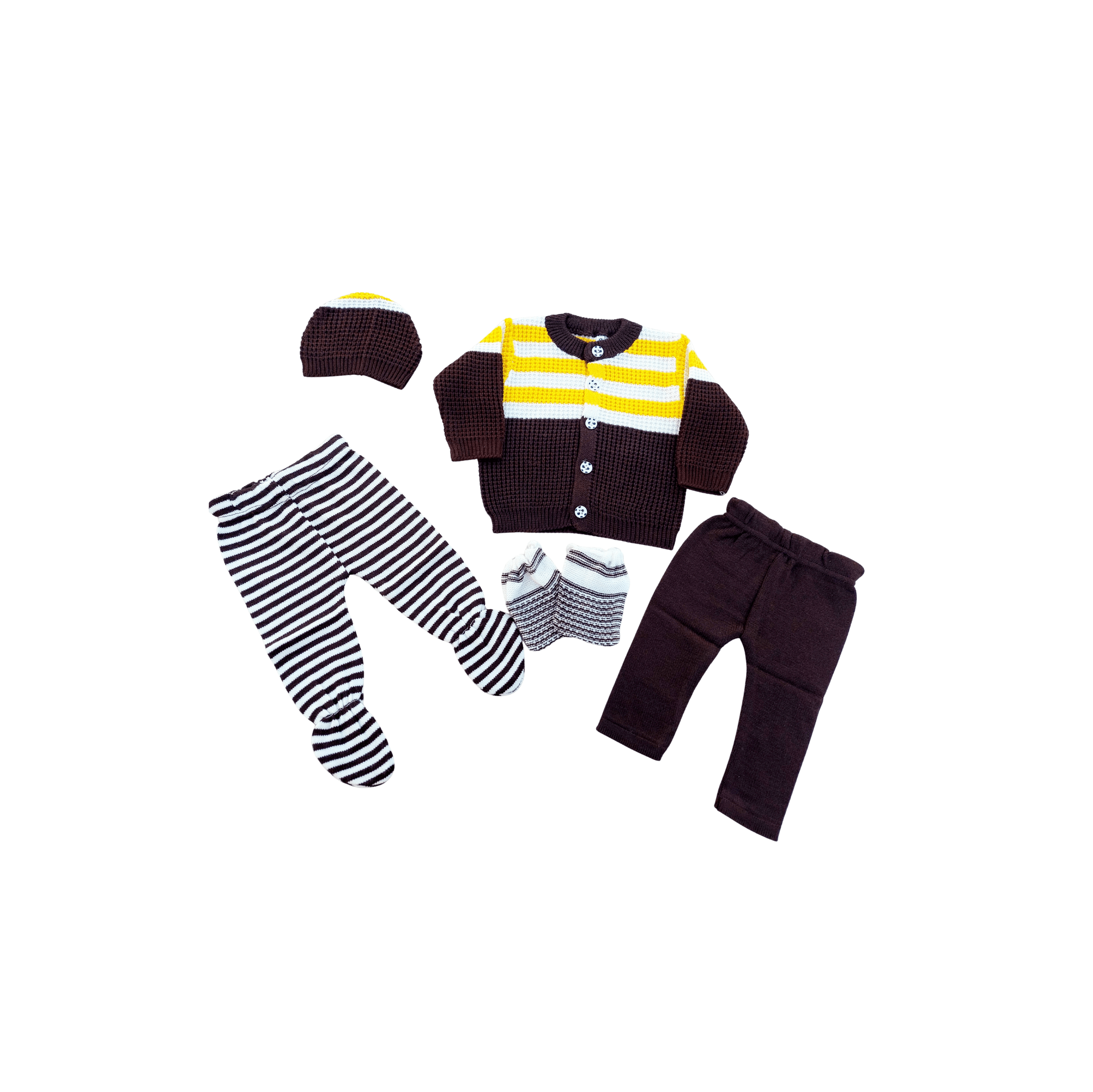 This woolen 5pc includes a woolen sweater, footed pajama mittens, cap and a pajama.